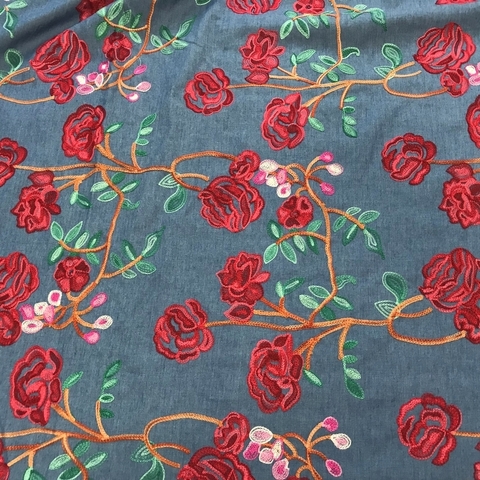 Ткань джинсовая голубая с вышивкой цветы по всему полотну. Подходит для пошива платьев, сарафанов, юбок, шорт, туник, топов, брюк, костюмов. Италия. Состав 100% хлопок Ширина 140 см. Допускается небольшое отклонение цветопередачи. Дополнительные фото и видео по запросу.