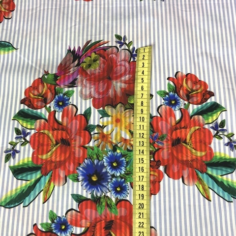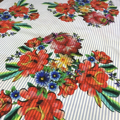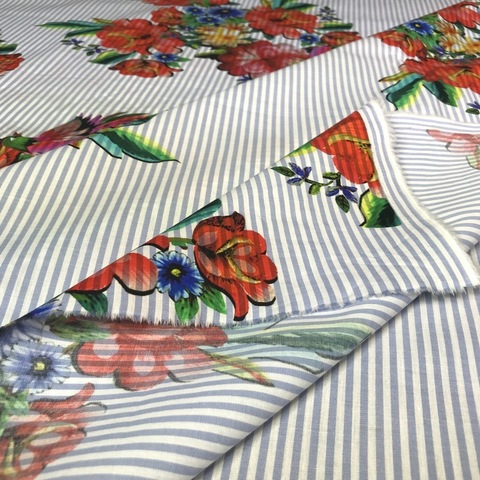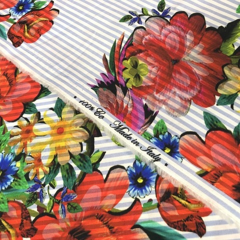 Ткань хлопок Alta Moda. Принт: букеты цветов на фоне мелкой голубой полоски. Подходит для пошива платья, юбки, топа или рубашки. Тонкая, непросвечивающая фактура. Хлопок 100%. Ширина 136 см. Производитель Италия. Допускается небольшое отклонение цветопередачи. Дополнительные фото и видео по запросу.