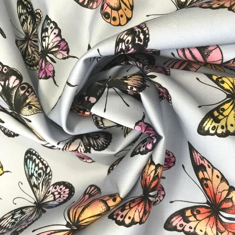 Ткань хлопок голубой с бабочками. Формоустойчивый, средней плотности. Подходит для брюк, юбок, платьев, сарафанов, топов. Не просвечивает, можно без подклада. Италия. Состав 97% хлопок, 3% эластана. Допускается небольшое отклоненение цветопередачи. Дополнительные фото и видео по запросу.