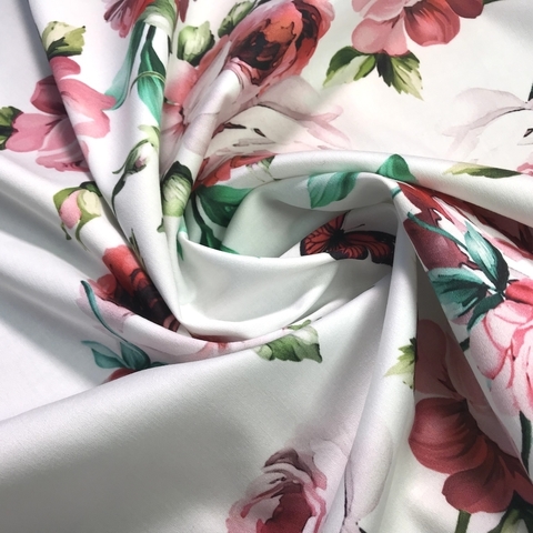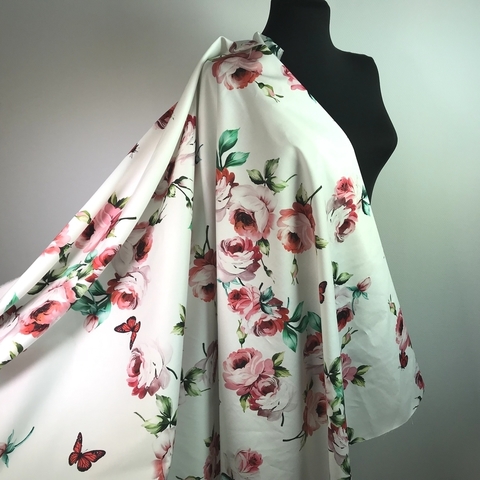 Ткань хлопок сатин с эластаном. Принт розы на белом фоне реплика Дольче Габбана. Формоустойчивый хлопок. Подходит для брюк, юбок, платьев, сарафанов, топов. Не просвечивает, можно без подклада. Италия. Состав 97% хлопок, 3% эластан. Допускается небольшое отклоненение цветопередачи. Дополнительные фото и видео по запросу.
