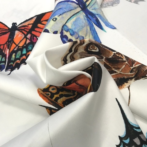 Ткань хлопок сатин с эластаном. Принт бабочки большого размера на белом фоне. Хлопок формоустойчивый, средняя плотность. Подходит для платьев, сарафанов, юбок, костюмов, топов. Не просвечивает, можно без подклада. Италия. Состав 97% хлопок, 3% эластан. Допускается небольшое отклонение цветопередачи. Дополнительные фото и видео по запросу.