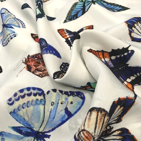 Ткань хлопок сатин с эластаном. Принт бабочки среднего размера на белом фоне. Хлопок формоустойчивый, средняя плотность. Подходит для платьев, сарафанов, юбок, костюмов, топов. Не просвечивает, можно без подклада. Италия. Состав 97% хлопок, 3% эластан. Допускается небольшое отклонение цветопередачи. Дополнительные фото и видео по запросу.
