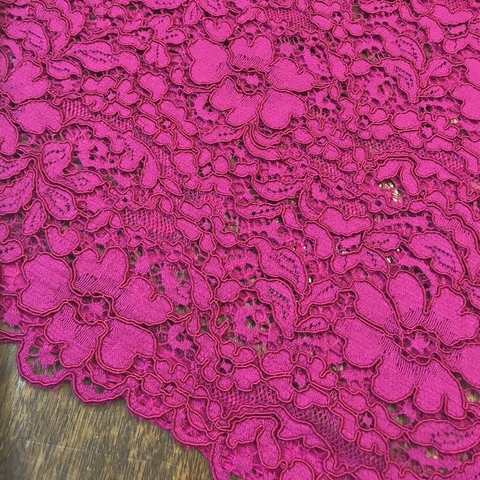 Ткань кружево кордовое. Фестон с одной стороны. Цвет фуксия. Для пошива платья, костюма, юбки, жакета, кардигана. Италия. Состав 46% вискоза, 39% хлопок, 15% нейлон. Ширина 140 см. Допускается небольшое отклонение цветопередачи. Дополнительные фото и видео по запросу.