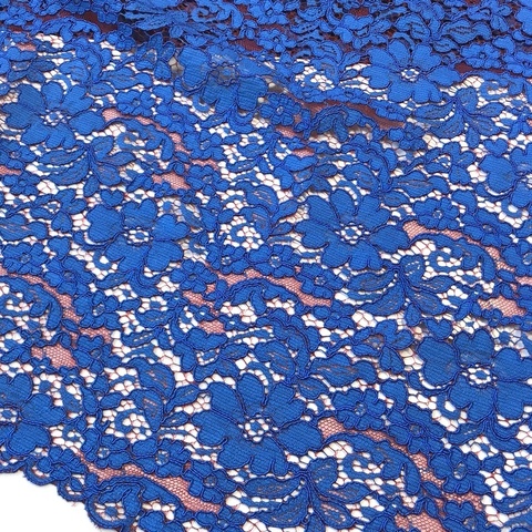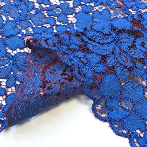 Ткань кружево кордовое. Фестон с одной стороны. Цвет ярко-синий, фон коричневый. Для пошива платья, костюма, юбки, жакета, кардигана. Италия. Состав 46% вискоза, 39% хлопок, 15% нейлон. Ширина 140 см. Допускается небольшое отклонение цветопередачи. Дополнительные фото и видео по запросу.