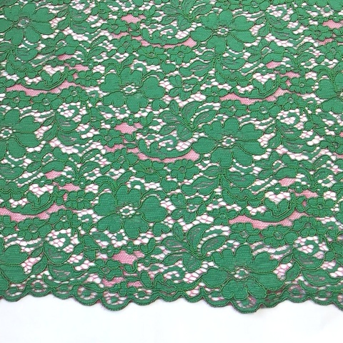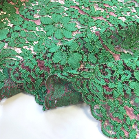 Ткань кружево кордовое. Фестон с одной стороны. Красивое сочетание зеленого с розовыми нитями. Для пошива платья, костюма, юбки, жакета, кардигана. Италия. Состав 46% вискоза, 39% хлопок, 15% нейлон. Ширина 140 см. Допускается небольшое отклонение цветопередачи. Дополнительные фото и видео по запросу.