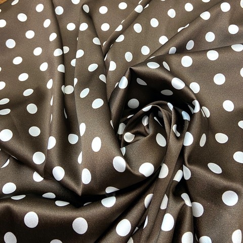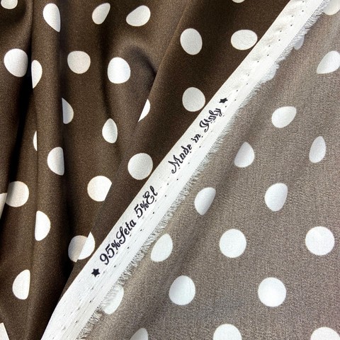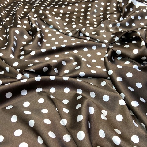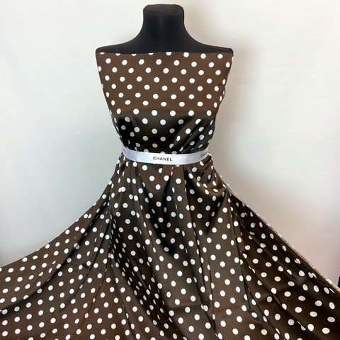 Ткань шелк атласный с эластаном. Коричневый шелк в белый горошек. Горошек 1 см размер. Шелк струящийся, не просвечивает. Подходит для платьев, юбок, сарафанов, блуз, топов. Италия. Ширина 135 см. Состав: 97% шелк, 3% эластан.