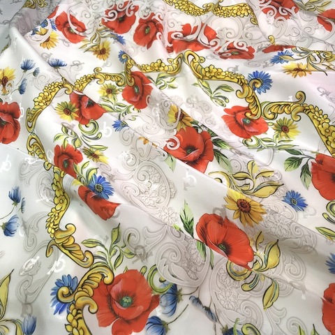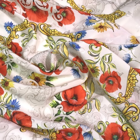 Ткань шелковый купон 90*90 см. 3 купона. Цветочный принт алые маки на молочном фоне. Идеально для пошива платка, платья, топа, туники, блузки или юбки. Матовая лицевая сторона и атласная изнанка. Струящаяся, пластичная фактура. Состав 100% шелк. Производитель Италия. Допускается небольшое отклонение цветопередачи. Дополнительные фото и видео по запросу.