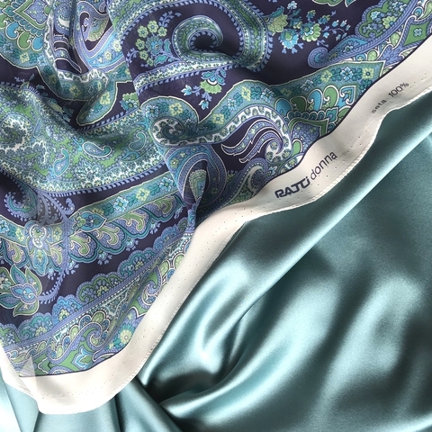 Ткань итальянский шелк бирюзового цвета. Не просвечивает, можно без подклада. Подходит для платьев, юбок, топов, блузок, подкладки. Италия. Состав 97 % шелк, 3% эластан. Ширина 135 см.