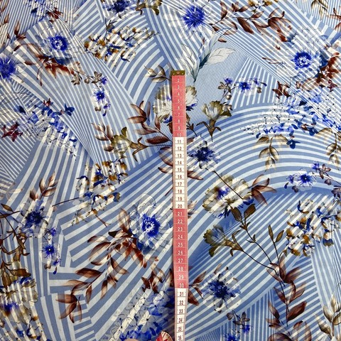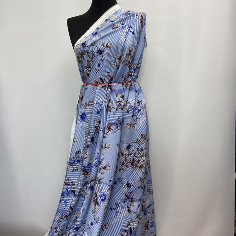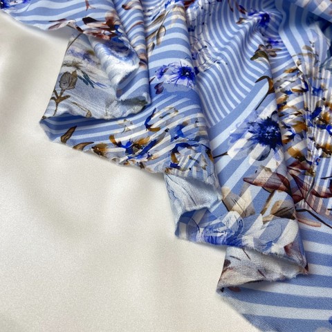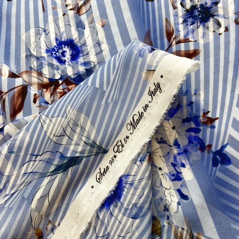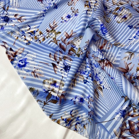 Ткань натуральный шелк матовый. Голубые цветы с голубыми хаотичными полосками на белом фоне. Для пошива платьев, блуз, юбок, сарафанов. Италия. Состав 98% шелк/2% эластан. Ширина 138 см. Допускается небольшое отклонение цветопередачи. Дополнительные фото и видео по запросу.