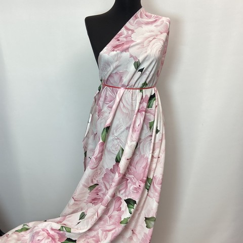 Ткань натуральный шелк матовый. Эффектные розовые пионы на белом фоне. Для пошива платьев, блуз, юбок, сарафанов. Италия. Состав 98% шелк/2% эластан. Ширина 138 см. Допускается небольшое отклонение цветопередачи. Дополнительные фото и видео по запросу.