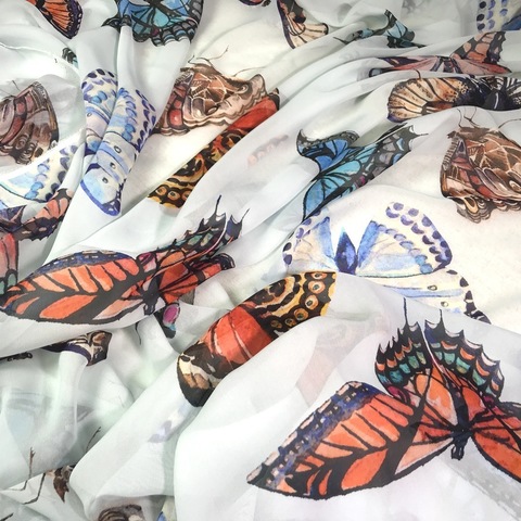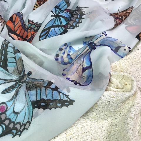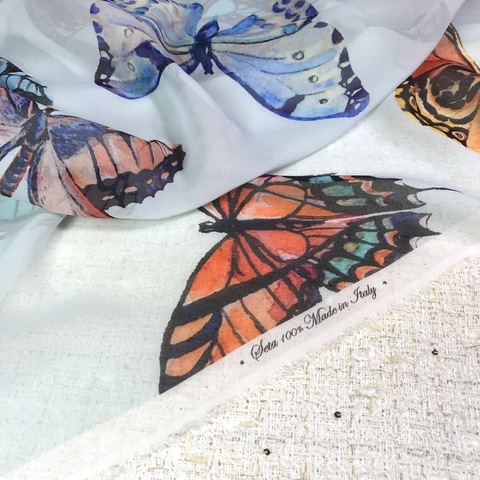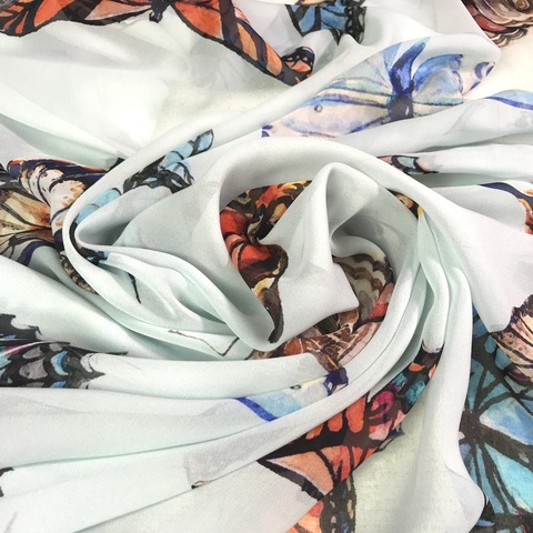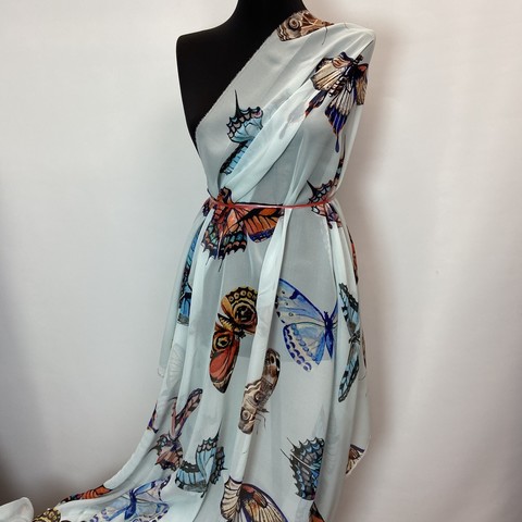 Ткань итальянский шифон шелковый голубой с большими бабочками. Подходит для платьев, юбок, топов, блузок. Состав 100% шелк. Ширина 135 см.