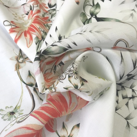Ткань вискоза белая с коралловыми цветами. Для пошива платьев, блуз, юбок, сарафанов, костюмов. Италия. Состав 100% вискоза. Ширина 140 см. Допускается небольшое отклонение цветопередачи. Дополнительные фото и видео по запросу.