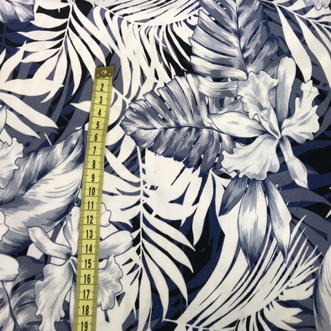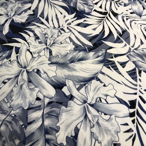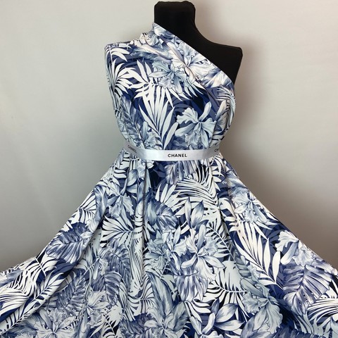 Ткань вискоза плательная с тропическими листьями и цветами синего цвета. Для пошива платьев, блуз, юбок, сарафанов, костюмов. Походит для оборок и валанов. Комфортная к телу. Италия. Состав 100% вискоза. Ширина 140 см. Допускается небольшое отклонение цветопередачи. Дополнительные фото и видео по запросу.