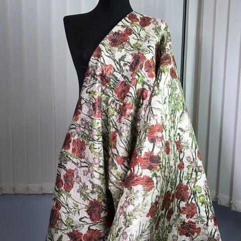 Ткань жаккард цветы красные гвоздики. Красивая и нарядная ткань. Формостойчивый жаккард. На юбки, костюмы, пиджаки, пальто. Состав: 46% хлопок, 38% полиэстер, 5% другие нити. Италия.